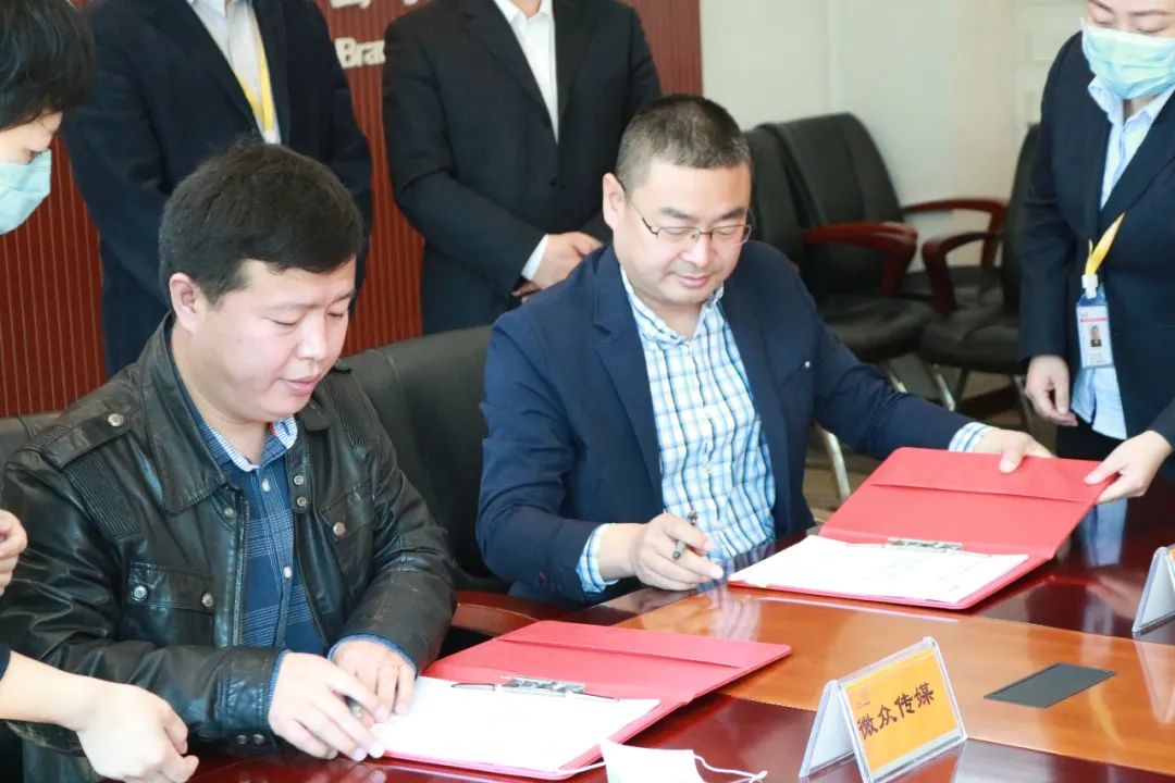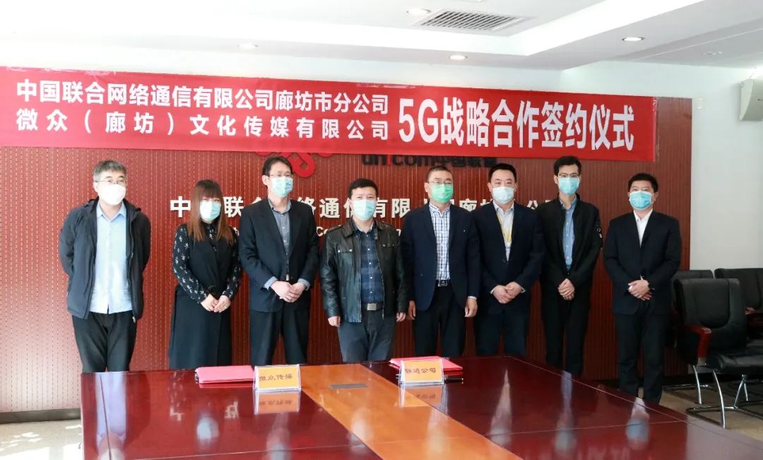 微众(廊坊)文化传媒有限公司与中国联合网络通信有限公司廊坊市分公司正式签署“廊坊智慧文旅5G信息化应用战略合作”协议发表时间:2020-04-03 22:43 为了积极推动5G研究和廊坊全城智慧旅游及文化产业发展,4月3日,微众(廊坊)文化传媒有限公司与中国联合网络通信有限公司廊坊市分公司正式举行“廊坊智慧文旅5G信息化应用战略合作”签约仪式,微众传媒公司总经理王锡术、联通公司政企事业部总经理吕元军等双方公司代表出席仪式。