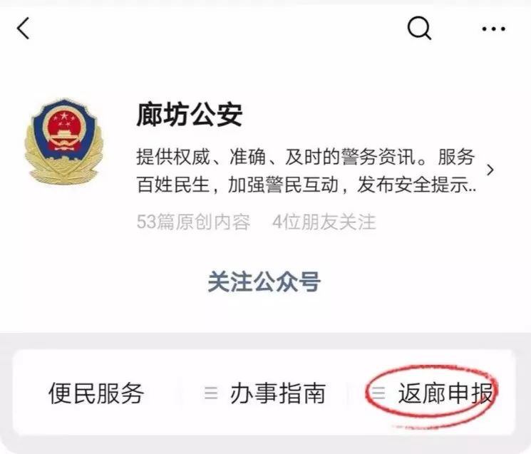 2 申报对象 答:我市严格落实“逢车必查、逢人必测”的刚性要求,即:对所有车辆、人员一律核录信息、一律登记;对发热人员及其同行人员一律进行医学处置。 3 健康筛检点 答:与廊坊市界交界处国、省、县、乡道路进入廊坊方向(不含县际之间设置的筛检点),高速公路下口入廊方向、以及火车站出口处设置健康筛检点,对来廊所有人员、车辆进行严格检查、检测、登记,确保不漏一车、不漏一人。 4 登记申报使用 答:方式一:按照来廊坊人员个人信息申报操作指南进行操作,如实填报个人有关信息及出行方式等,提交成功后保存自带二维码截图,在防疫检查点测体温时,将此二维码提供给工作人员,进行核验。 来廊坊人员个人信息申报操作指南 (根据需要升级) 一、打开微信搜索框;
